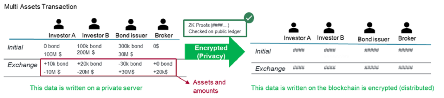 Figure. Example of a complex transaction with several parties and sensitive information. Left - is transparent, Right – is encrypted but verified with ZKPs.