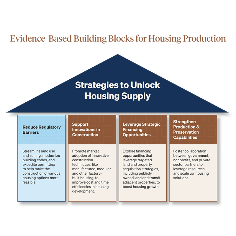 The series will follow the building blocks outlined below—strategies that can help reinforce housing production ecosystems when applied at the state and local levels. The first paper in this series will dive into the first building block: state and local strategies to reduce regulatory barriers and unlock housing supply through land use, zoning, building code, and permitting reforms.