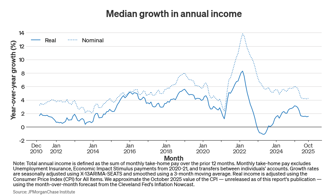 Figure 1. Median real income growth fell in early 2025 and as of October remained near levels observed during the weak labor market in the early 2010s.