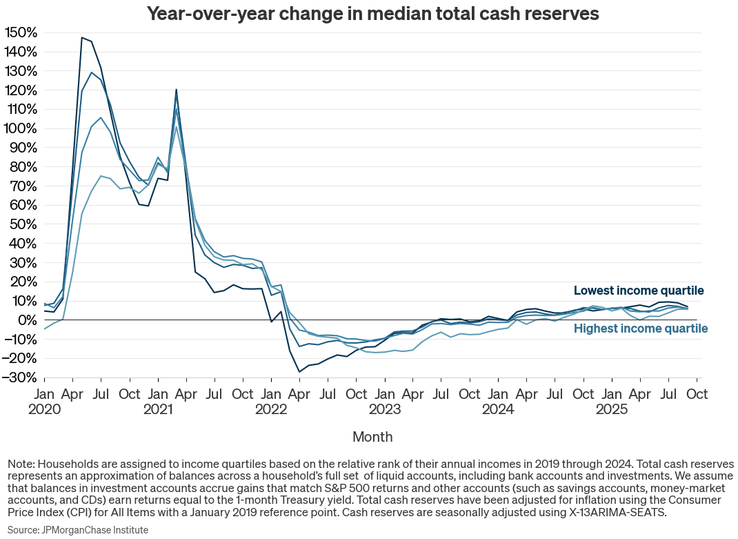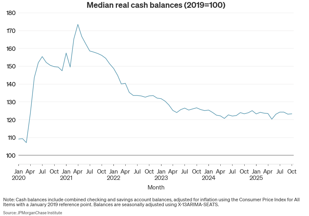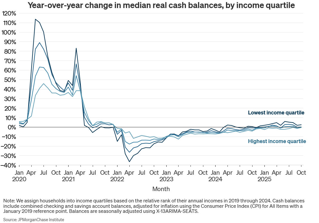 Households are going into the end of the year with weak income growth and bank balances that remain flat, after adjusting for inflation. Young people continue to underperform the typical early career growth pattern amid the slowdown in hiring, while about half of workers aged 50-54 are experiencing negative real year-over-year income growth as of October 2025. Households’ cash balances have been holding steady on a real basis, although households putting more money in higher yield alternatives may be weighing on bank balance growth. With pandemic-era excess cash liquidity in the rearview mirror, consumers are facing a holiday spending season with budgets tempered by tepid income growth but augmented by strong stock market gains—the latter highly unequally distributed.