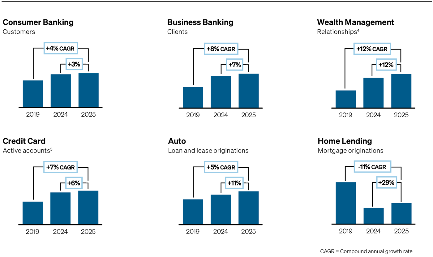 Payments and lending innovation: Payments are core to everything we do because they are core to everything customers do. We saw $7 trillion in payments volume last year, growing at an 11% rate since 2019 (up 9% year-over-year). The payments landscape is increasingly dynamic, with rapid innovation in new payment methods reshaping how customers transact. We continue to invest in a suite of payments and lending options to give customers flexibility in how they pay and borrow.