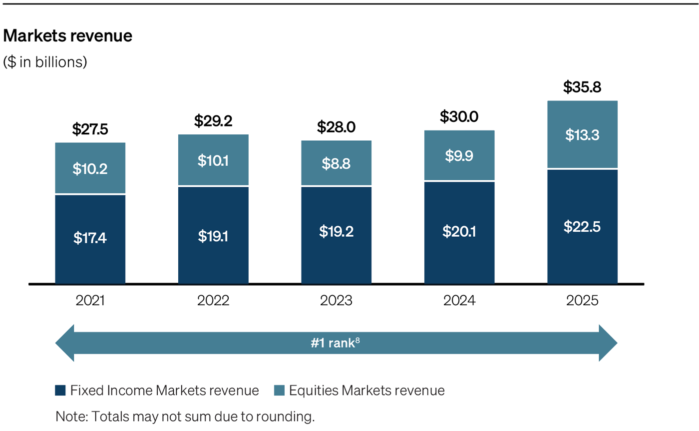 This reputation as a reliable partner in all market environments translated into standout performance. Markets revenue reached a record $35.8 billion, up 19% from 2024. Fixed Income revenue grew 12% to $22.5 billion, driven primarily by strong results in Rates, Currencies & Emerging Markets, Commodities and Securitized Products. Macro products — especially Commodities — benefited from the heightened volatility and safe-haven demand, pushing precious metals to record highs by year-end. Similarly, Equities reported standout growth, setting a new revenue record of $13.3 billion, powered by solid performance across products particularly in Equity Derivatives.