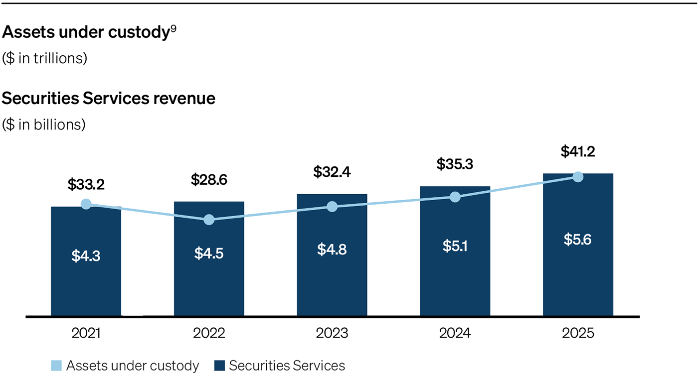 Securities Services also set new benchmarks last year. As the only global custodian operating alongside leading markets, payments and banking franchises, we offer front-to-back client capabilities — from research and execution through clearing, settlement and custody — and the ability to manage complex assets at scale.