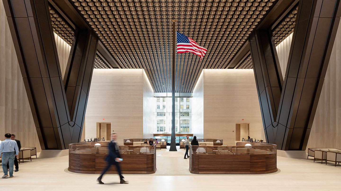 A flagpole column sculpted in bronze serves as a centerpiece in the lobby, visible from both Madison and Park Avenues.