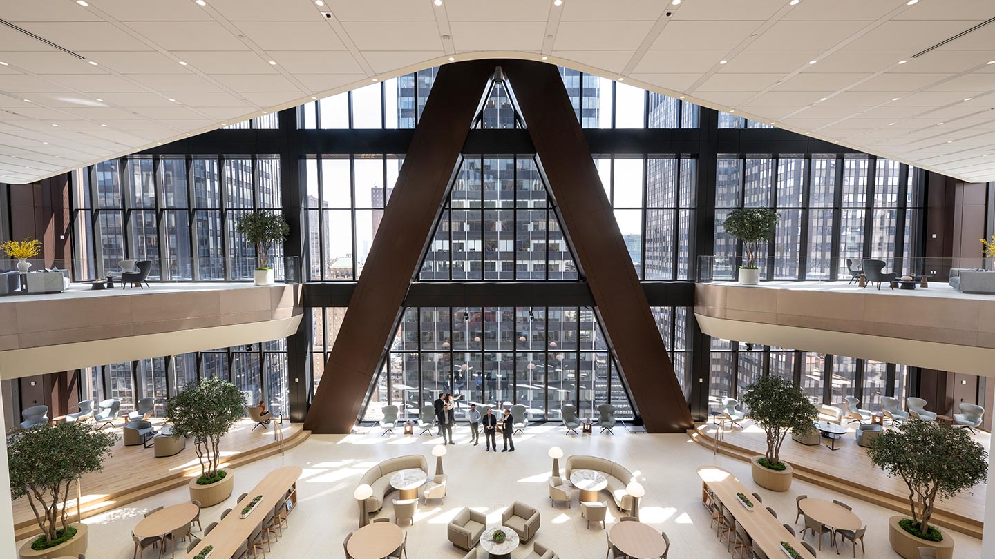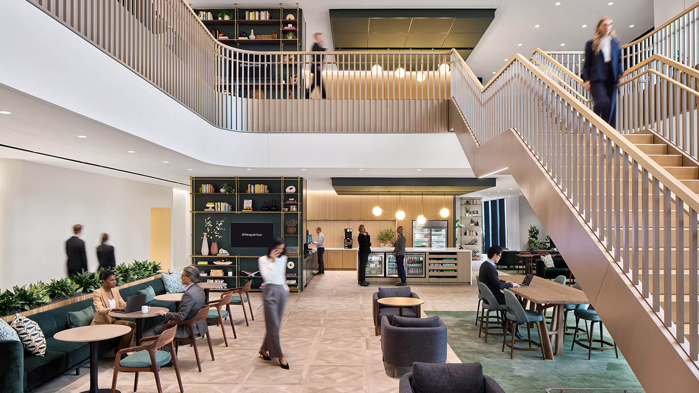 JPMorganChase’s triple-height hub with communal space, dining areas and flexible meeting space that can accommodate large gatherings.